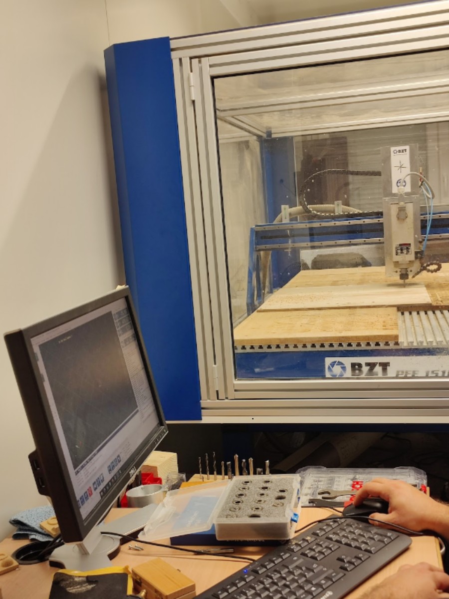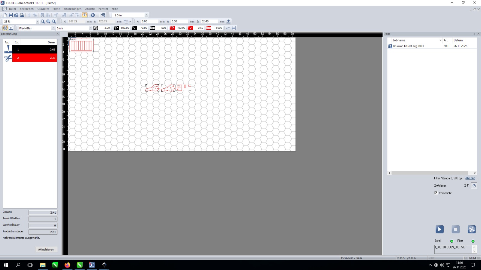 After a short explanation of how the laser operates and which materials can (and cannot) be processed, the vector file was imported into the laser cutter software. Power, speed, and number of passes had to be set carefully depending on the material and thickness.