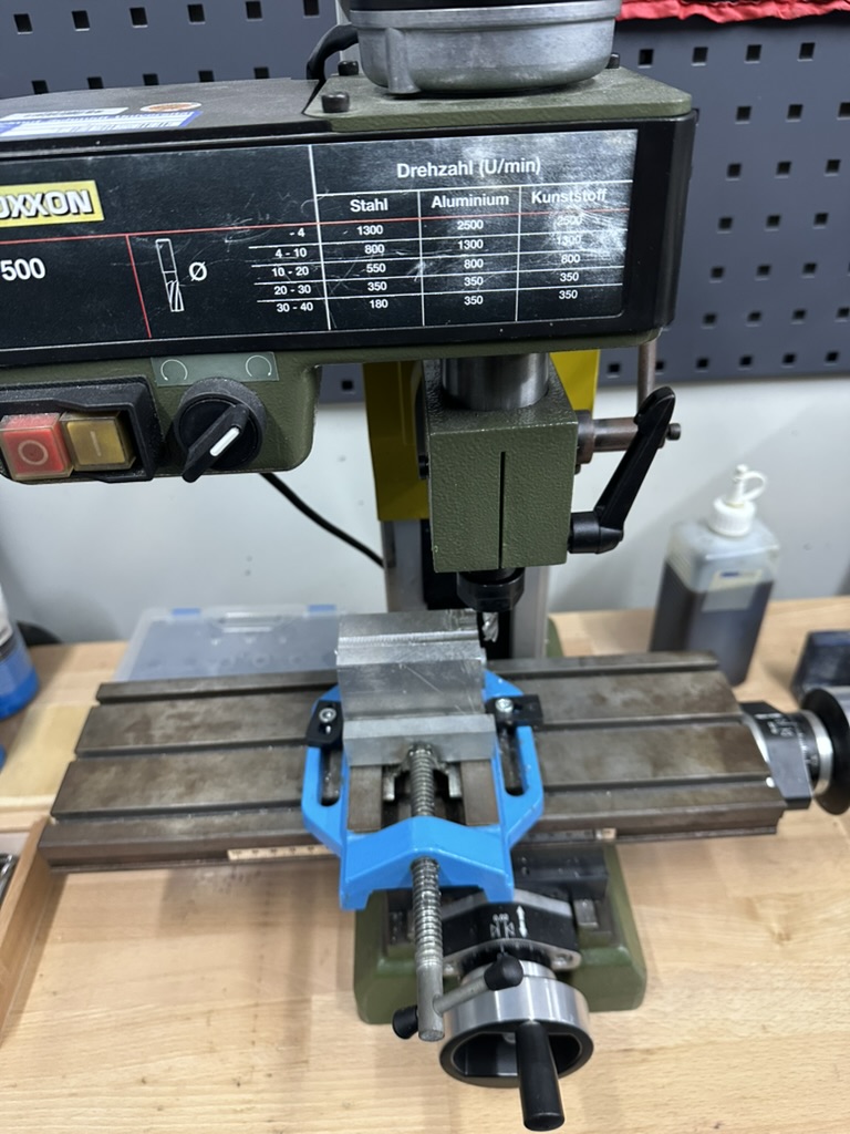 On the conventional milling machine and the lathe, there was much more to learn and try out. After reading and understanding all safety instructions, the first task was to mill a groove into an aluminium block.
